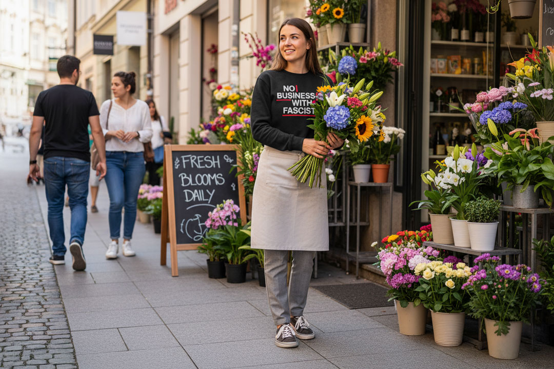 Als Selbständige, als Unternehmer*innen oder Ladenbesitzer*innen haben wir eine Verantwortung. Unsere wirtschaftlichen Entscheidungen haben eine politische Wirkung – sie können entweder demokratische Werte stärken oder menschenfeindliche Strukturen begünstigen. Wir entscheiden, mit wem wir Geschäfte machen – und mit wem nicht. Wenn wir klarstellen, dass wir keine Geschäftsbeziehungen mit Faschist*innen oder faschistischen Organisationen eingehen, dann setzen wir ein Zeichen. Ein Zeichen gegen Hass, gegen Ausgrenzung, gegen die Normalisierung von rechtsextremem Gedankengut.